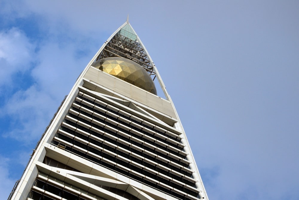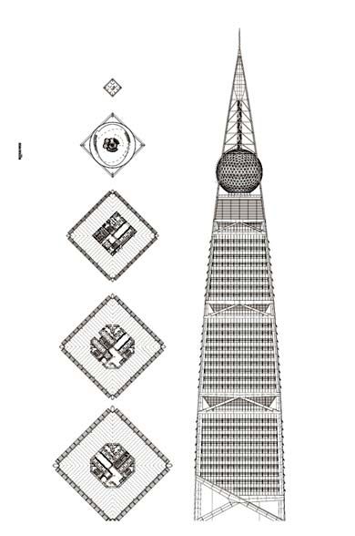 من أجمل ناطحات السحاب برأيي وذلك بسبب التقوس في الأعمدة الموجودة في الزوايا والتقائها في نقطة في أعلى البرج وكذلك وجود الكرة الذهبية والفانوس المضيء في الأعلى.
