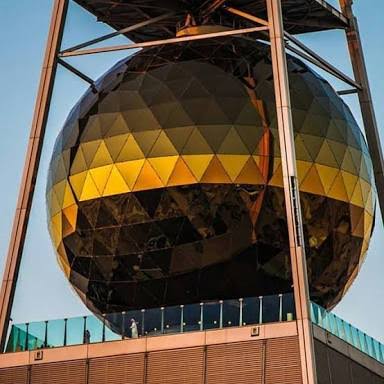بعد الـ 30 طابقًا من المساحات المكتبية، يضم البرج مطعمًا يقع داخل كرة زجاجية ذهبية على ارتفاع 200 متر فوق مستوى سطح الأرض.