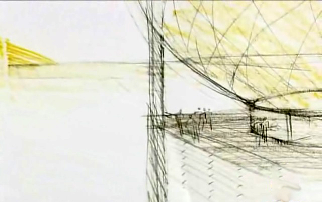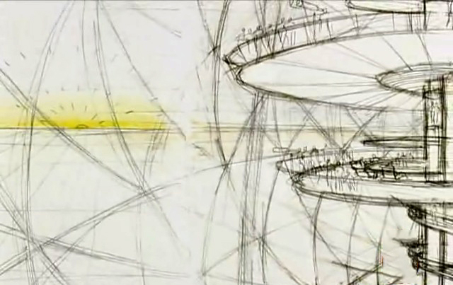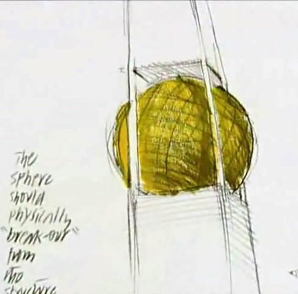 التصميم الأساسي لم يكن يحوي الكرَة الزجاجية في القمَة كما هي اليوم، ولكن المالك أصر على زيادتها واستغلالها كمطعم مطل على المدينة. وهنا اسكتشات أولية للكرة الزجاجية بيد نورمان فوستر.