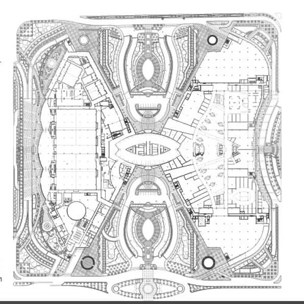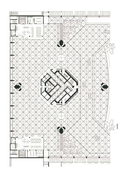 المسقط الأفقي المربع هو مسقط مفتوح ومرن ويمكن تقسيم الفراغ فيه إلى 16 فراغ منفصل كحد أقصى. تم دمج المربع مع باقي المجمع من خلال ردهة مكونة من خمسة طوابق في قاعدة البرج، ويرتبط البرج بالفندق في الشمال والشقق ومركز التسوق في الجنوب.