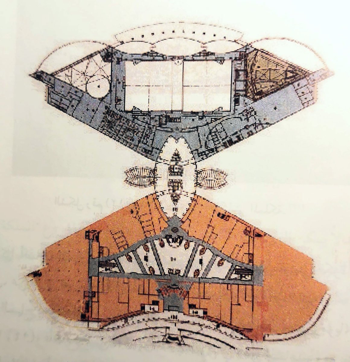 قُسم المبنى إلى 4 أجزاء محمولة على دعامات خرسانية مائلة على شكل K مقلوب، للتقليل من تواجد الأعمدة في الواجهة ونقل الأحمال لأعمدة الزاوية. هذا التشكيل الذي قصده المعماري بحسب قوله، ولكنه أنتج في النهاية الشكل المثلث الذي يميز العمارة النجدية وقد استنبطه بعض النقاد.