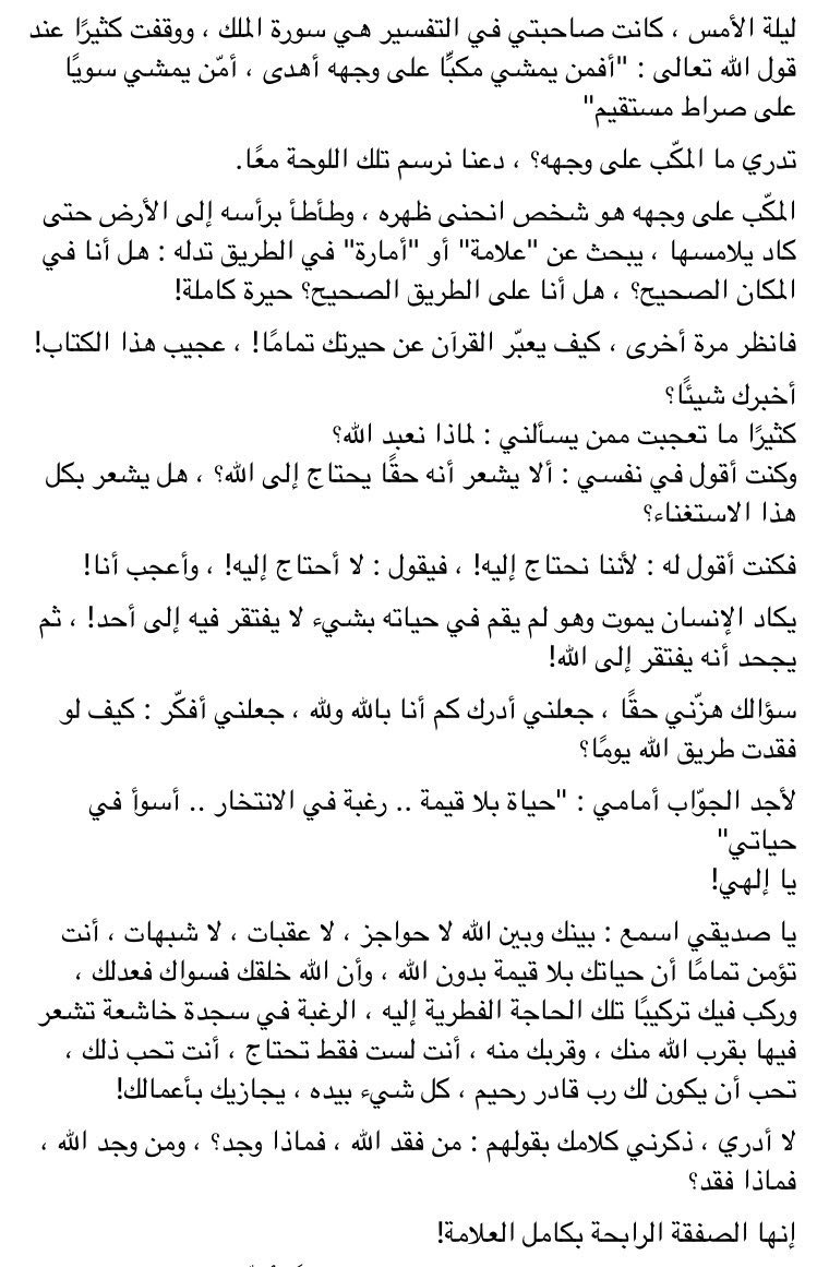"لذلك لا تيأس أبدًا! أما عن ضيقك الذي قد يدفعك للعودة للغفلة، فهو أن للمعاصي نشوة، تشبه الإدمان، وذلك الخواء والفراغ بداخلك هو بداية العلاج"