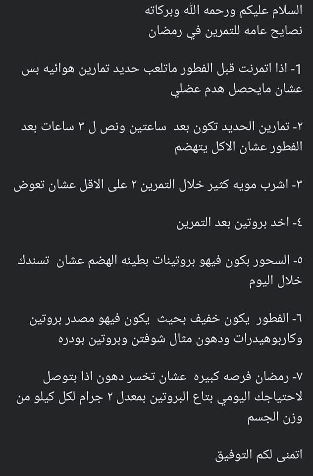 2- ممكن بعد الافطار بساعه و ما لازم الشخص يدفس نفسه فل عشان يحافظ على مستويات السكر فالدم و ما يدخل في حالات الخمول و التعب و الصداع بعد الافطار بسبب ال (refeeding syndrome).