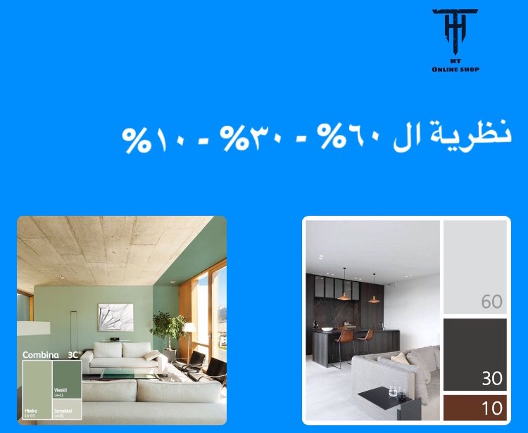 ولون ثالث توظيفه بنسبة ١٠% زي الأصفر ال ممكن يكون في اكسسوارات زي الوسائد.