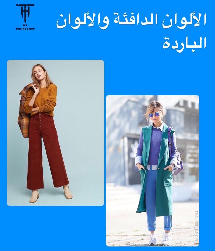 والألوان الباردة وهي العكس وبتدي إحساس بالهدوء والراحة وهي درجات الأرزق والأخضر والبنفسجي، ويفضل تنسيق الألوان حسب لون بشرتك وشعرك وعيونك او اللينسز الحتلبسيهم
