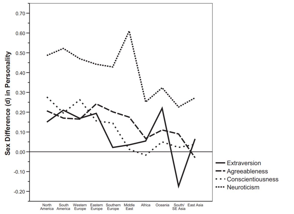 على العكس من ذلك، في المجتمعات الأكثر ازدهارًا ومساواة، تصبح السمات الشخصية للرجال والنساء أقل تشابهًا. علاوة على ذلك ،