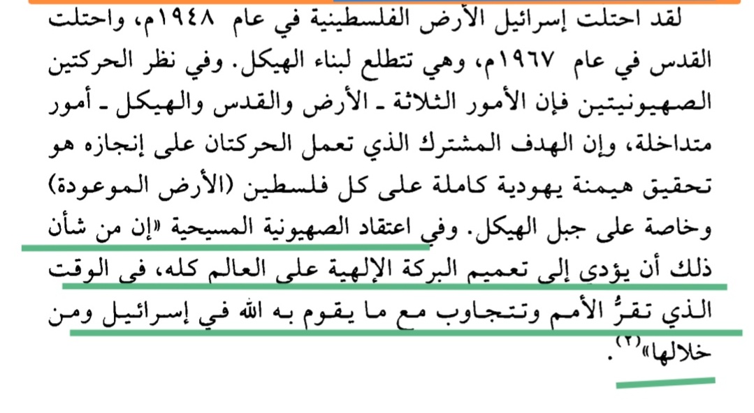 ووصل حال المسيحيين الصهاينة بالاعتقاد:(أن من شأن تمكين اليهود من فلسطين حلول البركة الإلهية على العالم في، الوقت الذي تقر الأمم وتتجاوب مع مايقوم به الله في إسرائيل ومن خلالها..) #ماذا_بعد_قيادة_المرأة1396