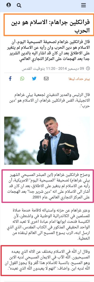 أما القس فرانكلين غراهام الذي لطالما أشاد به الرئيس الأمريكي بوش فهو صاحب الهجوم الواسع الذي، شنه على الإسلام ف:(وصفه بدسن الإر8اب والظلام والشر والكفر حتى🤔)