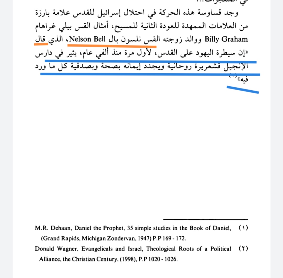 ومن قبله أعلن القس والمبشر الأمريكي نيلسون بيل اغتباطه من سيطرة اليه8ود على القدس قائلا:(إن سيطرة اليهود على القدس لأول مرة منذ2000 عام يثير في دارس الإنجيل قشعريرة روحانية ويجدد إيمانه بصحة وصدقية كل ما ورد فيه..)