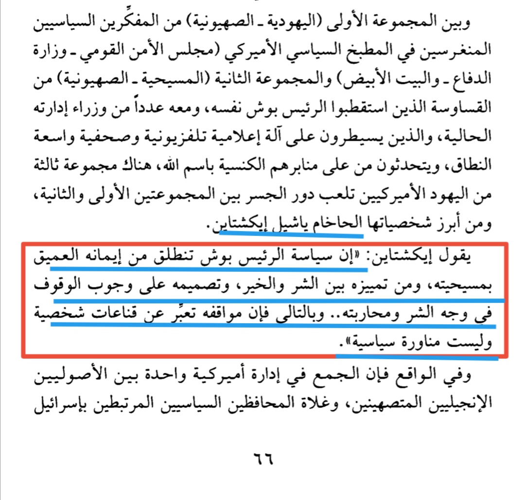 وأثنى الحاخام اليهودي يتشيل إيكشتاين على سياسة بوش الابن قائلا:(إنها سياسة تنطلق من إيمانه العميق بمسيحيته ومن تمييزه بين الخير والشر.... وإصراره على الوقوف بوجه الأشرار ومحاربتهن...) 🤔🤔
