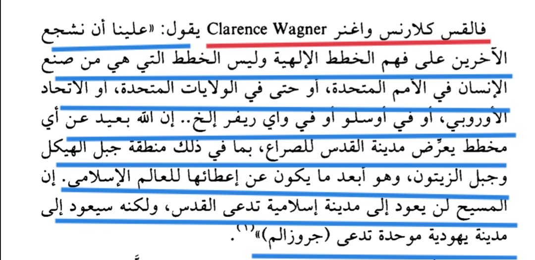 يقول القس كلارنس واغنر:(علينا أن نشجع الآخرين على فهم الخطط الإلهية وليس خطط الإنسان في الأمم المتحدة إن الله أبعد مايكون عن إعطاء القدس للمسلمين وإن المسيح لن يعود إلى القدس الإسلامية بل إلى أورشليم اليهودية. #السعودية #وزارة_التعليم #القدس