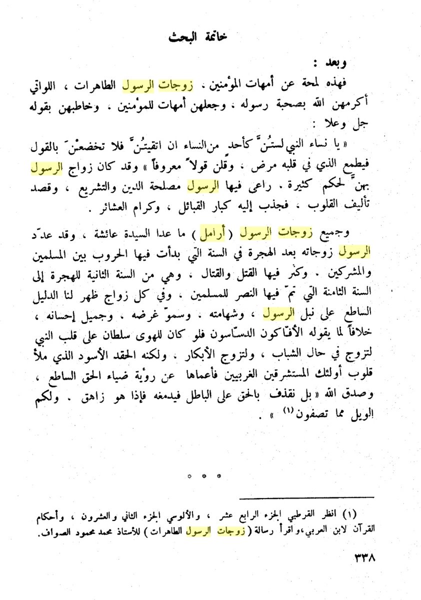 تزوج رسول الله خديجة وكانت قبله تحت عتيق ثم تزوج عائشة ثم تزوج حفصة وكانت قبله تحت خنيسن ثم تزوج سودة وكانت قبله تحت السكران ثم تزوج أم حبيبة وكانت قبله تحت عبيد الله ثم تزوج أم سلمة وكانت قبله تحت أبي سلمة وجميع زوجات الرسول أرامل ومطلقات ما عدا عائشة