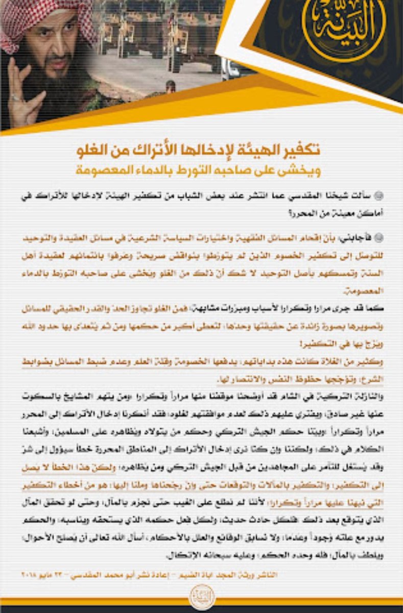 وأخيراً ساحة الشام الكاشفة التي فضحه الله فيها شر فضيحة نوثق جزءاً يسيرا من إفساد المقدسي لساحات الجهاد؛ تبيانا للمسلمين وإبراء لذمة المجاهدين