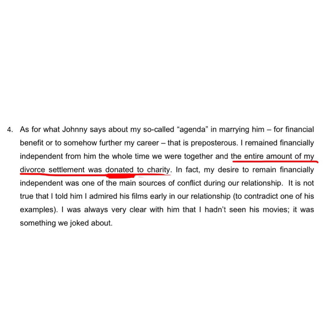 وقالت بالمقال أنها ما كانت تشوف نفسها ضحية، لكن بعد سنتين (تقصد لما خلصت فترة زواجها من جوني) صارت أيقونة إعلامية ووجه لحركة #MeToo ولقت فرصة أنها تتكلم لأن فيه ناس كثير راح يسمعون صوتها وبيكون قوة كلمتها أكبر