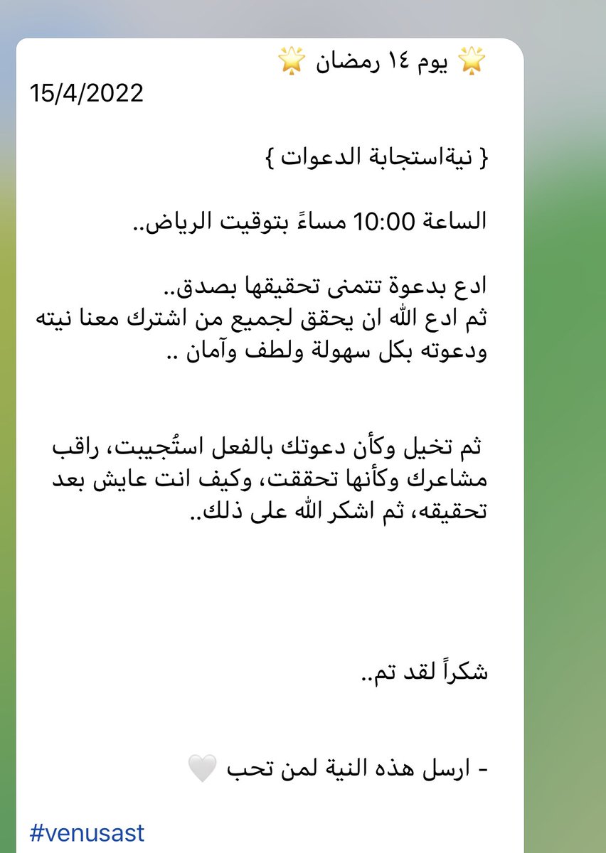 التي تجعلنت نرى ونشهد أثر دعواتنا ونوايانا ونتصل بطاقة تجسيدها بكل تيسير وسلام ولُطف اللّهم انني أسألك أن ( تذكر نيتك وتُشرك الاخرين لتُضاعف طاقة الخير لك ولغيرك ) دون الحاجة يا الله للشقاء والتعب والتأخير وتجسيد المخاوف التي تتعلق بهذه النية دون الحاجة للشك وخلق معيقات ..يتبع