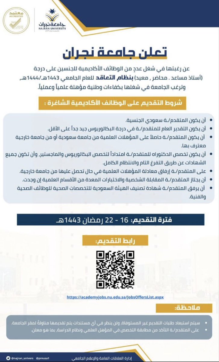 ثريد📚تعلن جامعة نجران عن رغبتها في شغل عدد من الوظائف الأكاديمية للجنسين بكفاءات وطنية مؤهلة علميًّا وعمليًّا على درجة (أستاذ مساعد ـ محاضر ـ معيد) بنظام التعاقد للعام الجامعي 2022م