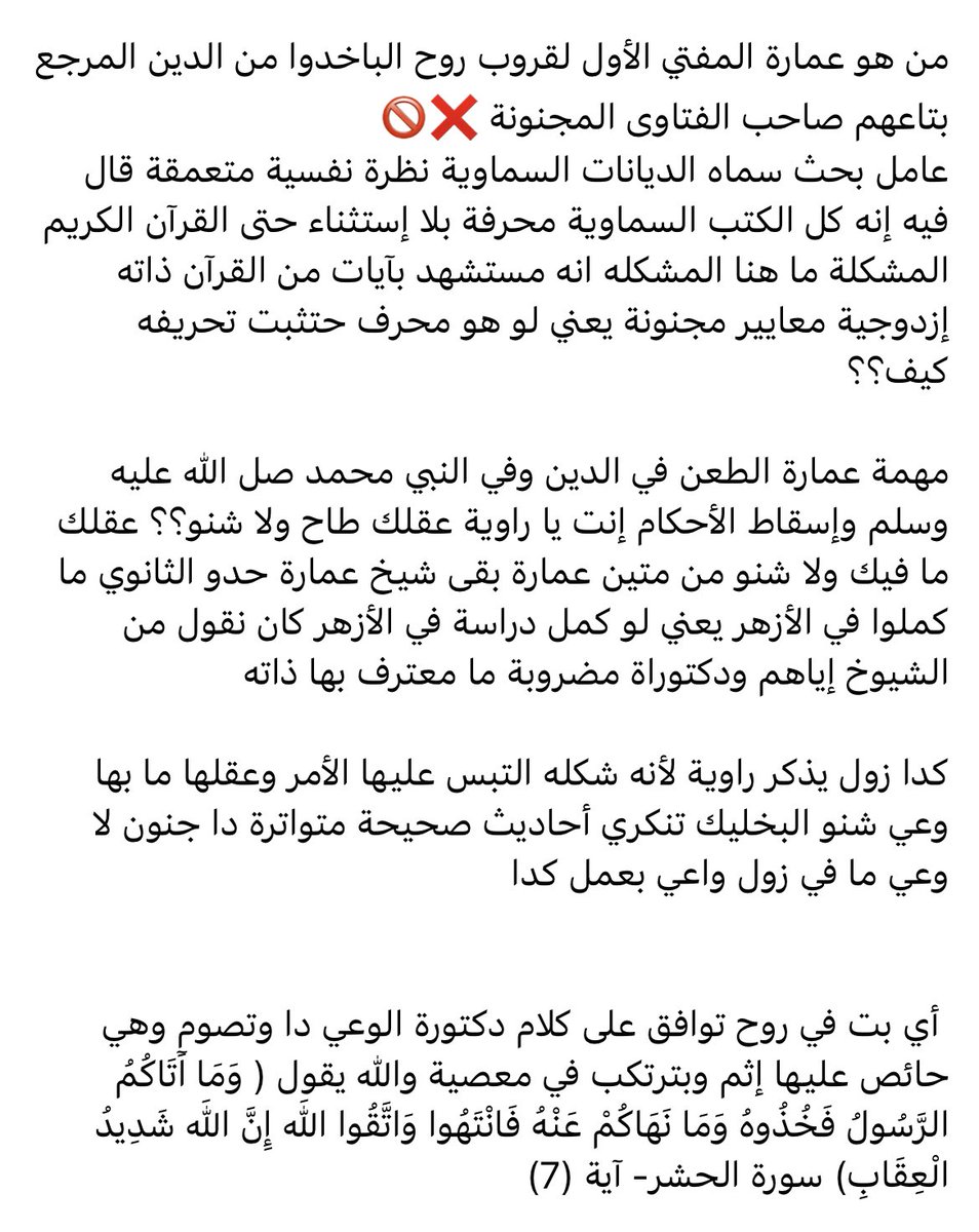 أيعقل الواحد يخلى كل علماء أهل السنة والجماعة المتخصصين في العلوم الشرعية وأفنوا عمرهم كله فيه وملتزمين بمنهجية القرآن والسنة في البحث والإستقراء عشان ياخذ في مسألة شرعية كلام أحمد عمارة بكالريوس علم نفس من الأزهر دكتوراه في علم الطاقة والروحانيات