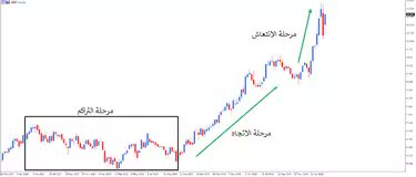 ☑️ الاتجاه الصاعد: مرحلة التراكم - مرحلة الاتجاه - مرحلة الانتعاش