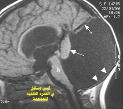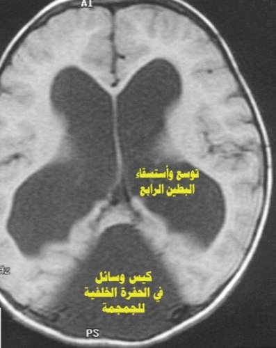 كما تتكون أكياس بحجم كرة الجولف عند المصابين بالأمراض الخلقية، و تورم مما يسبب ضغط متزايد على الدماغ، ويؤدي إلى ظهور مشاكل عصبية خطيرة.