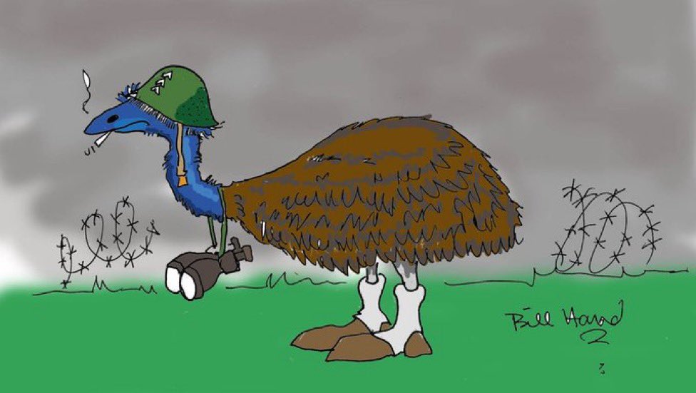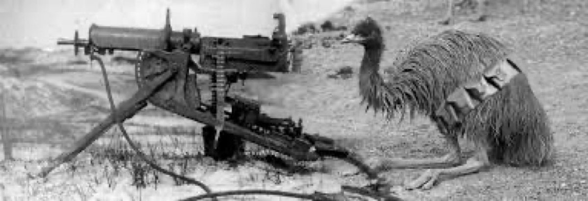 «إن أحلام المهاجمين الرشاشة الفارغة في إطلاق النار على أعداد كبيرة من طيور الإيمو قد تبددت قريباً. من الواضح أن قيادة الإيمو أمرت بتكتيكات حرب العصابات !