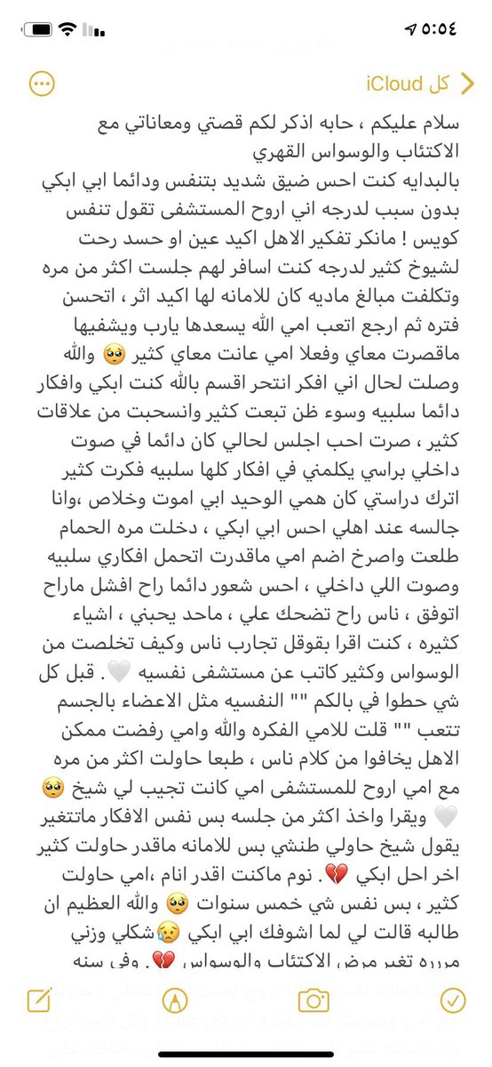 نصيحة لكل اب وام اذا جاك ابنك او ابنتك وقالت محتاجه علاج نفسي (معالج نفسي )لا ترفض وتقول وش ناقصك وتذكره بكل شي او تقوله عليك بصلاه . خذه ورح إلى معالج بعد ما تسأل وتبحث عن المعالج الصحيح وصدقني إن ما نفع مراح يضره .. وتأكد ما طلب هذا إلا بعد معانه حرام أبنائكم يعانون عشان وصم