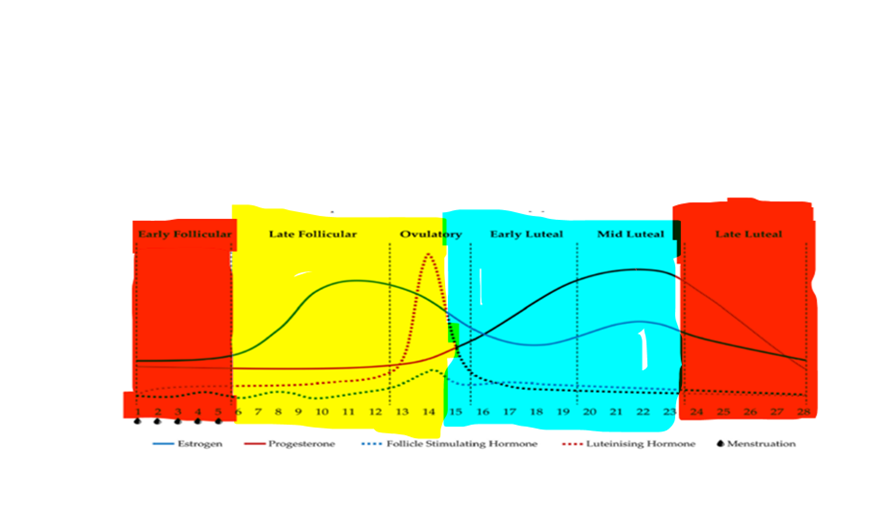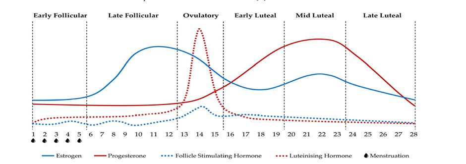 خلال مرحلة الدورة الشهرية يحدث تقلبات هرمونية عند الانثى وبعض الأبحاث تشير انه بالإمكان الاستفادة من هذا التقلبات الهرمونية في زيادة حجم التمرين في أوقات معينة خلال الدورة الشهرية حتى يستفيد الجسم في زيادة الكتلة العضلية والقوة .