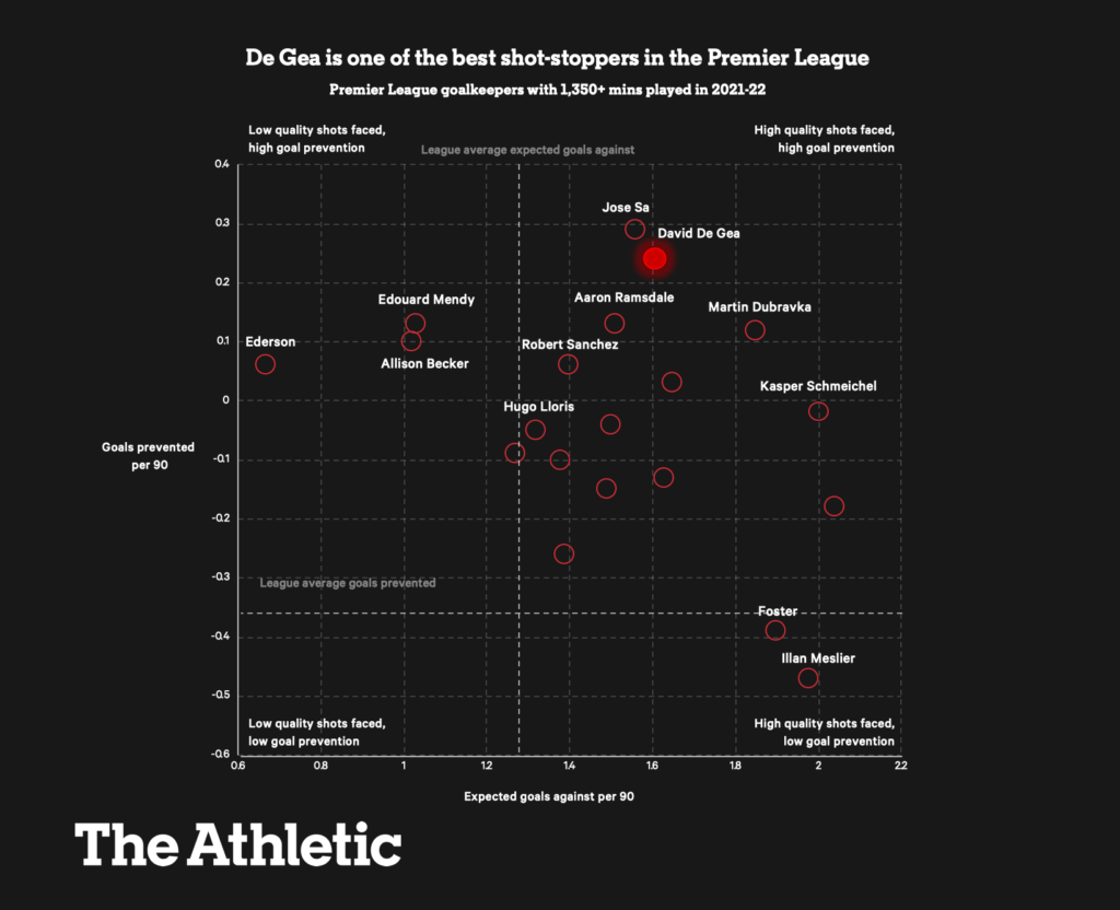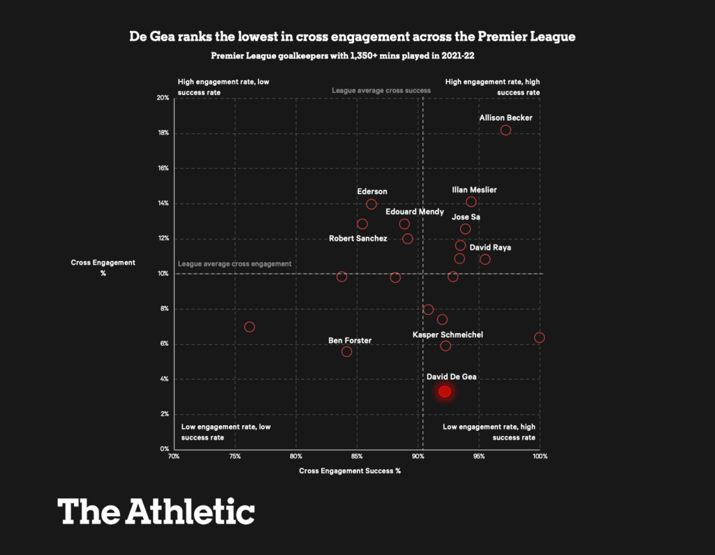 ولذلك فإن يونايتد دائمًا ما يكون منقوصًا من لاعب أثناء بناء اللعب. وبينما قد يكون حارس يونايتد الثاني دين هندرسون مناسبًا أكثر لأسلوب تين هاغ بالمقارنة مع دي خيا، فلا نعلم يقينًا ما إن كان يملك الإمكانيات اللازمة للعب في فريقٍ يسعى للفوز بالألقاب.