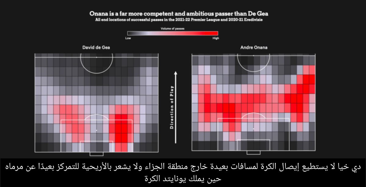 وربما أكثر جانب يهم تين هاغ هو أداء دي خيا بالكرة نظرًا لأنه لا يتناسب مع نوعية حراس تين هاغ، على عكس أندريه اونانا - الذي لعب أكثر من غيره في هذا المركز تحت قيادة تين هاغ في أياكس - الذي يُعد أحد أفضل الحراس بالكرة في أوروبا.