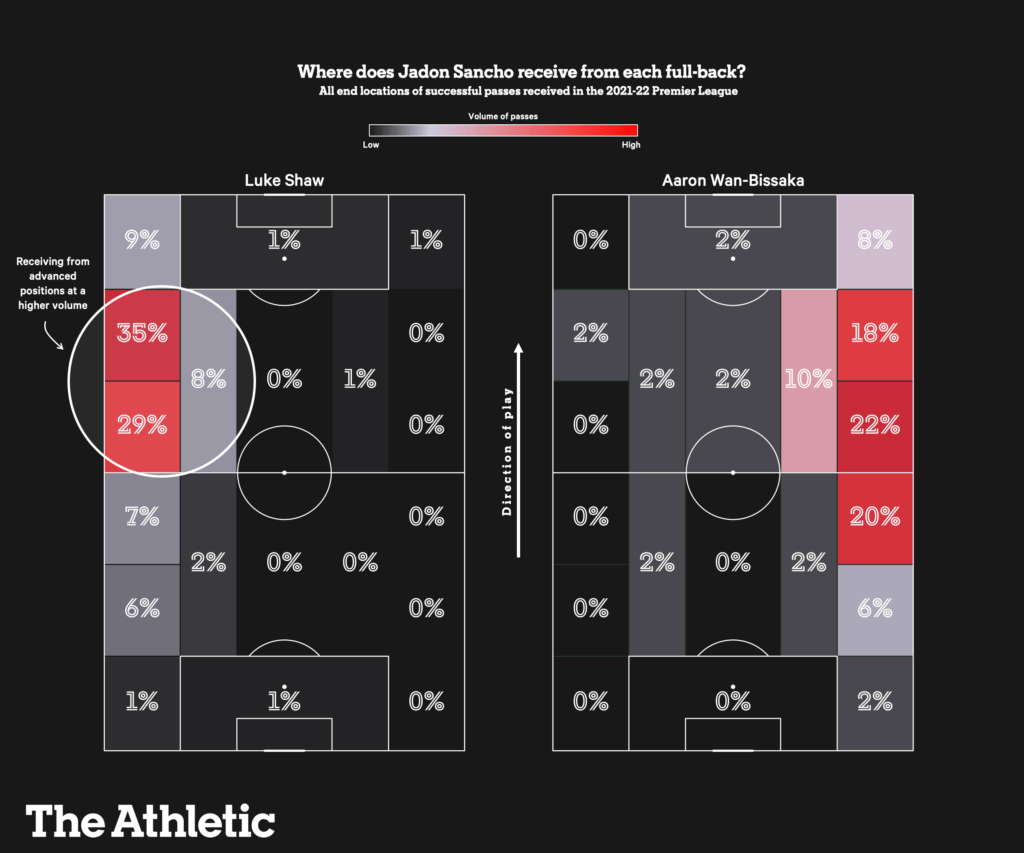 وبينما قد يكون هذا تكرارًا لكلامنا السابق فإن مانشستر يونايتد مازال يعتمد بشدة على الطرف الأيسر في تدرج الكرة فنجد أن من بين مجموعات التمرير التي تساهم في تقدم الكرة، أكثرها شيوعًا يأتي من اليسار - وبالأخص شو - مما يزيد من اختلال التوازن بين الطرفين.