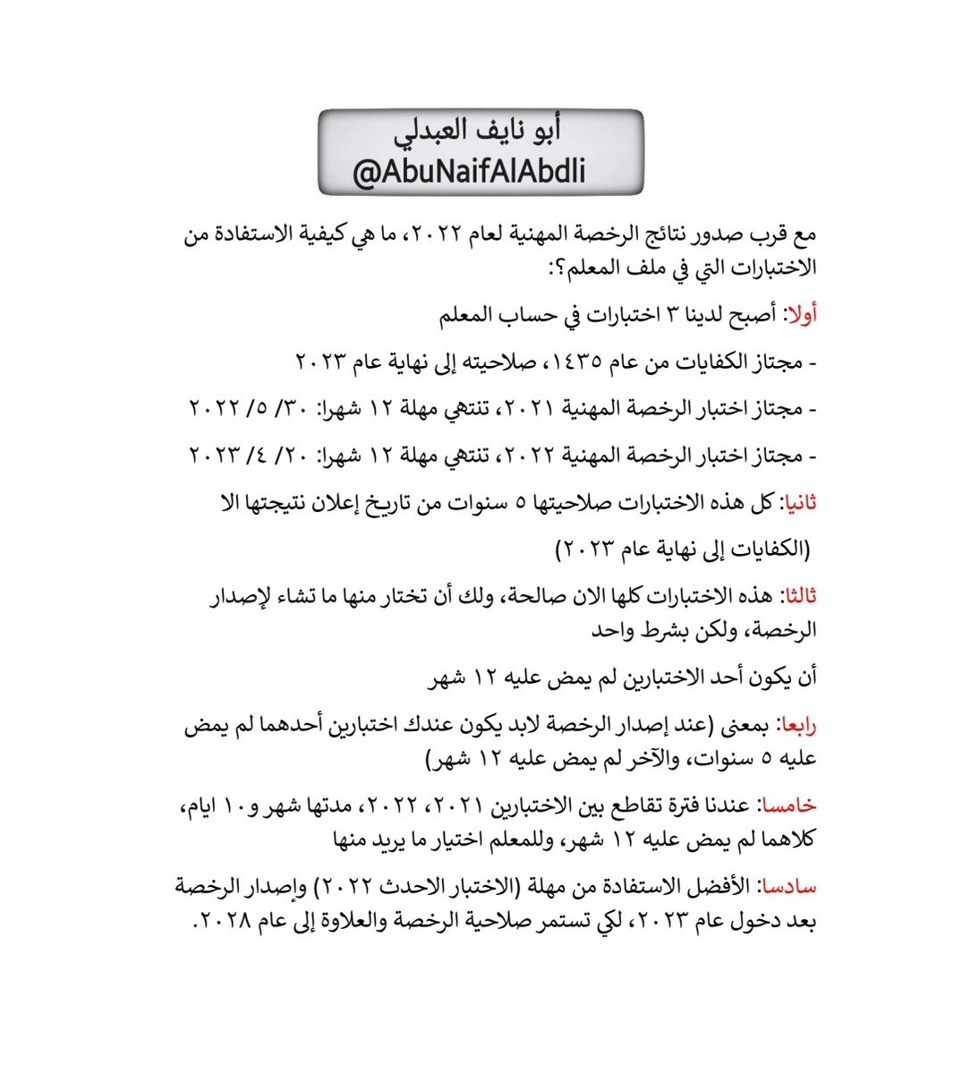 6️⃣ قاعدة مهمة: أي معلم اجتاز احد الاختبارين، ولم يجتز الاخر، فالمطلوب منه إعادة الاختبار الذي لم يجتزه، أما الاختبار الذي اجتازه فصلاحيته ٥ سنوات.