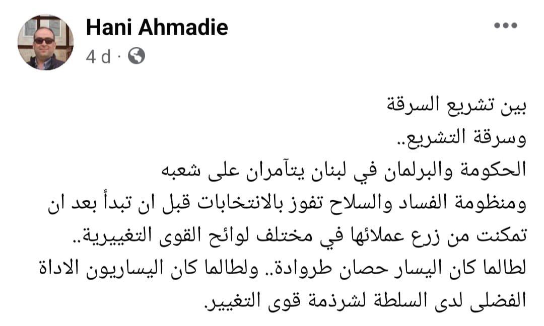 بيروت مدينتي انسحبت من اللايحة لأن تم تحجيمها واقصاء مرشحتهم. حزب لنا (حسن سنو) كمان انسحب. بس ما حدا قِبل ينفتح على احتمال تشكيل لائحة ثورية وتقدمية منسجمة منقدر ندافع عنها وبتحمل مشروع اقتصادي سياسي واضح وبيحقق تغيير جذري بوجه لائحة الانتهازيين.
