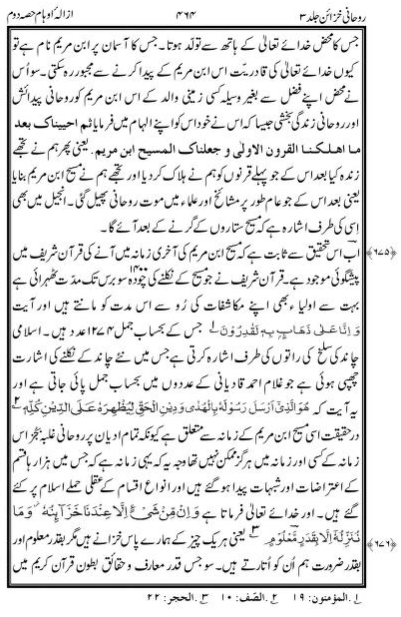 MGA moves one step further with his claim and writes in in his Ruhani Khazain vol 3 page 464, that his arrival is foretold in the Qur'an. He states:
