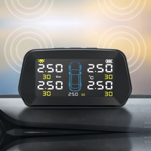 يمكنك استخدام نظام مراقبة ضغط الإطارات سيعلمك بمستوى الضغط المتناقص في أي من الإطارات, فيعطي إنذارًا اذا الضغط المنخفض ، الضغط العالي ، إنذار التسرب ، درجة الحرارة المرتفعة يحصل على الطاقة من خلال الشمس