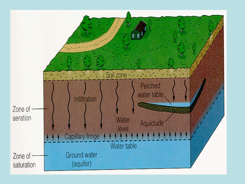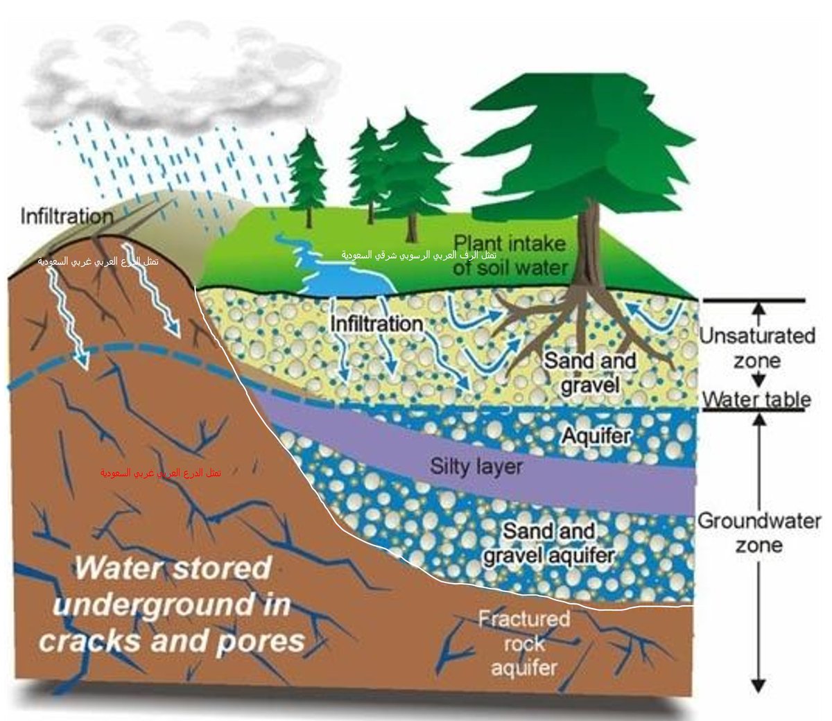 وهي تختلف عن شكل تجمعات المياه الجوفية في المناطق النارية (كما في الدرع العربي غربي #السعودية) حيث توجد على هيئة خزانات مائية محدودة وضيقة عبر التشققات الصخرية والصدوع.
