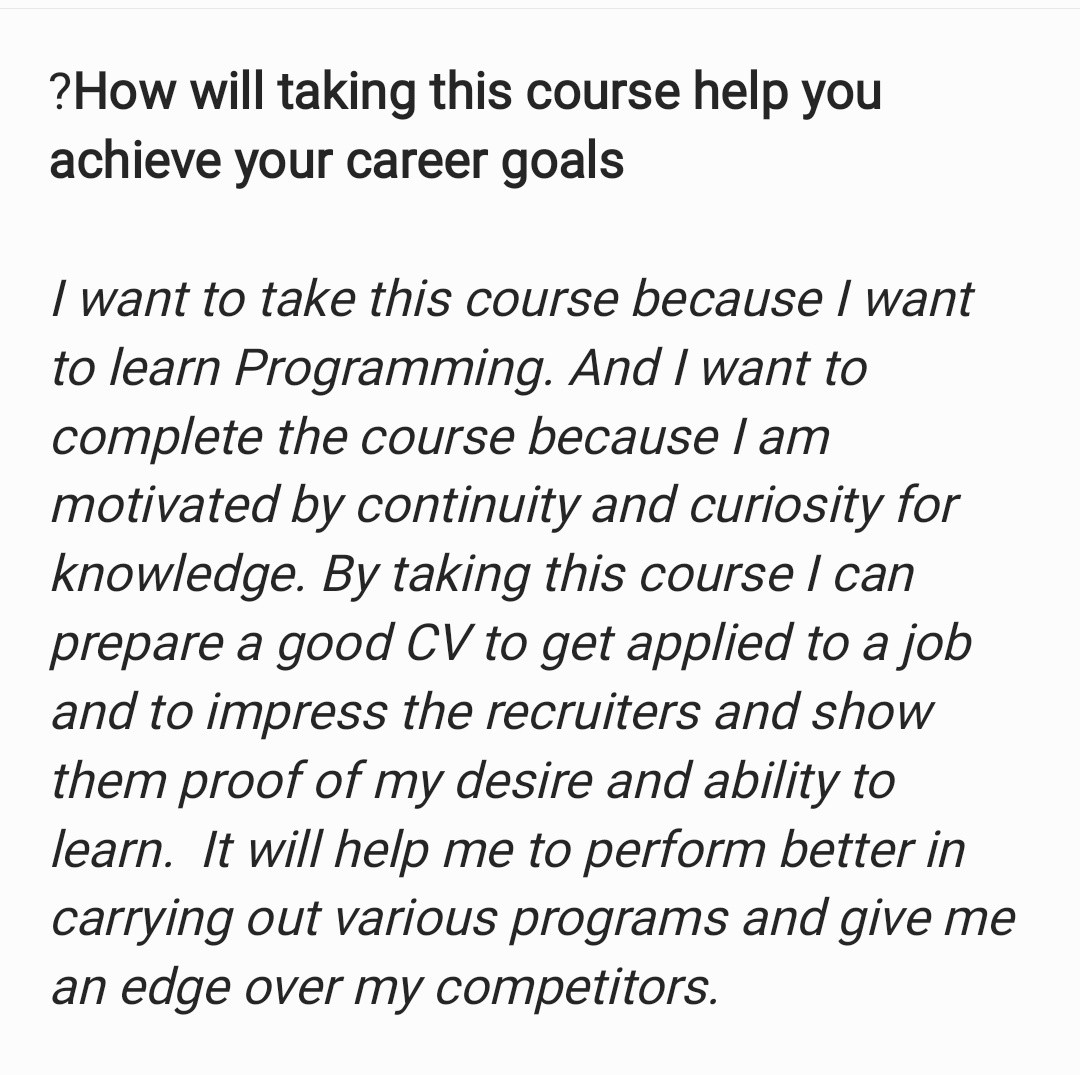 • اربط حالتك التعليمية (أو الوظيفية) بالدورة التي تقدم عليها، فإذا كنتَ تدرس مثلًا البرمجة.. اشرح كيف ترتبط هذه الدورة بحالتك التعليمية، وكيف أن حصولك عليها سيثري مستواك.