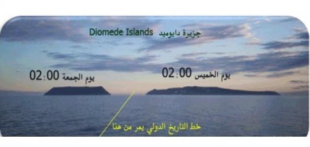 في منتصف المسافة الصغيرة جدًا بين الجزيرتين يمر خط التاريخ الدولي، ليحول دون اجتماعهما على توقيت واحد، إذ نرى ديوميدي الكبرى سابقة على أختها الصغرى بيوم كامل، وذلك على الرغم من قرب المسافة بينهما، والتي لا تتعدى بالضبط 3.8 كيلومترات.