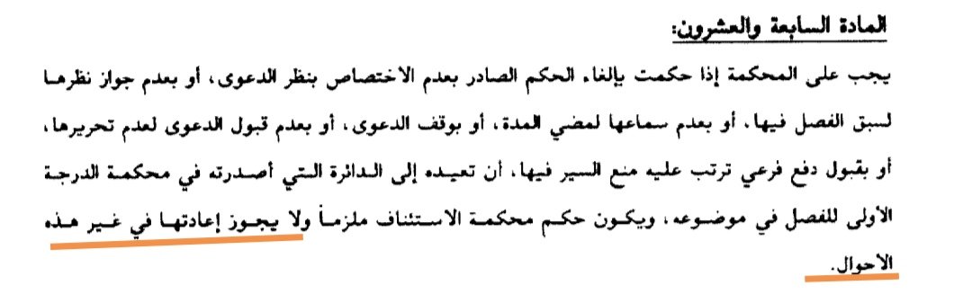 ولما أن إلغاء و إعادة محكمة الاستئناف ملزم بنص المادة ١٩٢ من نظام المرافعات فإن هذا الإجراء يجعل الحكم بعيداََ عن نظر المحكمة العليا لذلك فخطأ محكمة الاستئناف إن حصل بإعادة مالا يجوز إعادته لا يمكن ظهوره إلا بامتناع محكمة الدرجة الأولى عن نظر الدعوى مجددا.