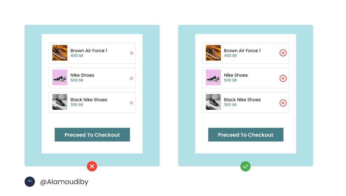 فالحل هنا مثل الصورة اللي على اليمين ان نكبر علامة الحذف عشان يقدر المستخدم يضغط عليها بسهولة.