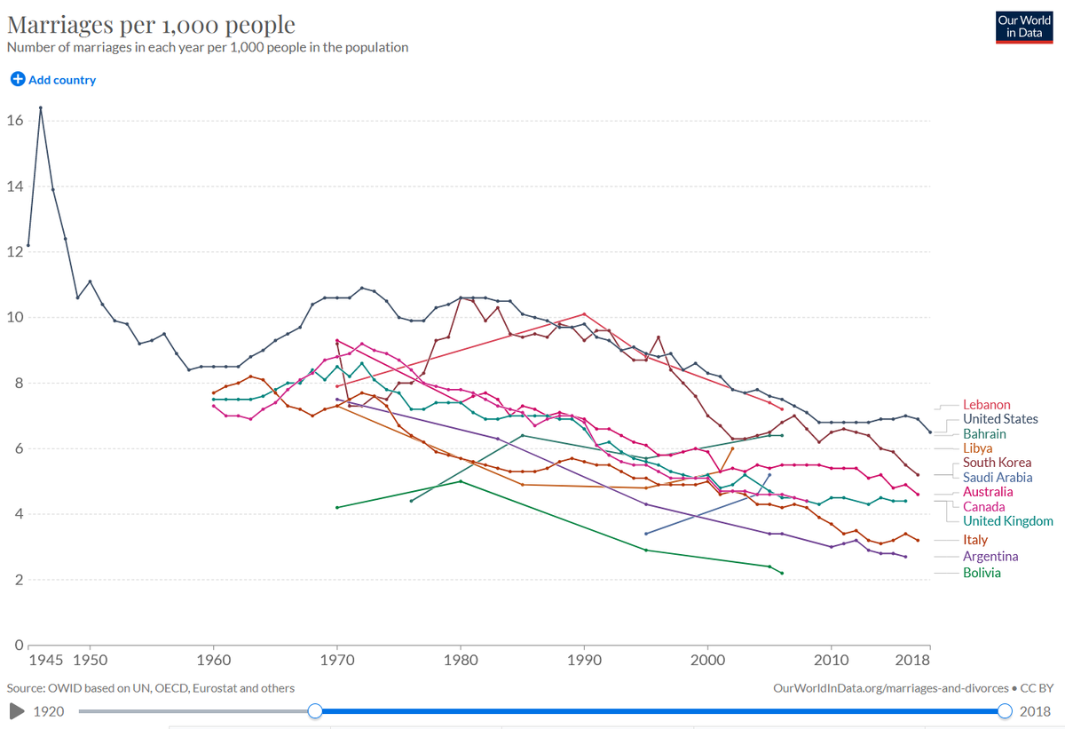 الزواج ، كمؤسسة اجتماعية ، موجود منذ آلاف السنين. مع وجود أشياء عمرها آلاف السنين ، من السهل افتراض أنها لا يمكن أن تتغير إلا ببطء. لكن التطورات منذ منتصف القرن العشرين تظهر أن هذا الافتراض خاطئ: في العديد من البلدان أصبح الزواج أقل شيوعًا.