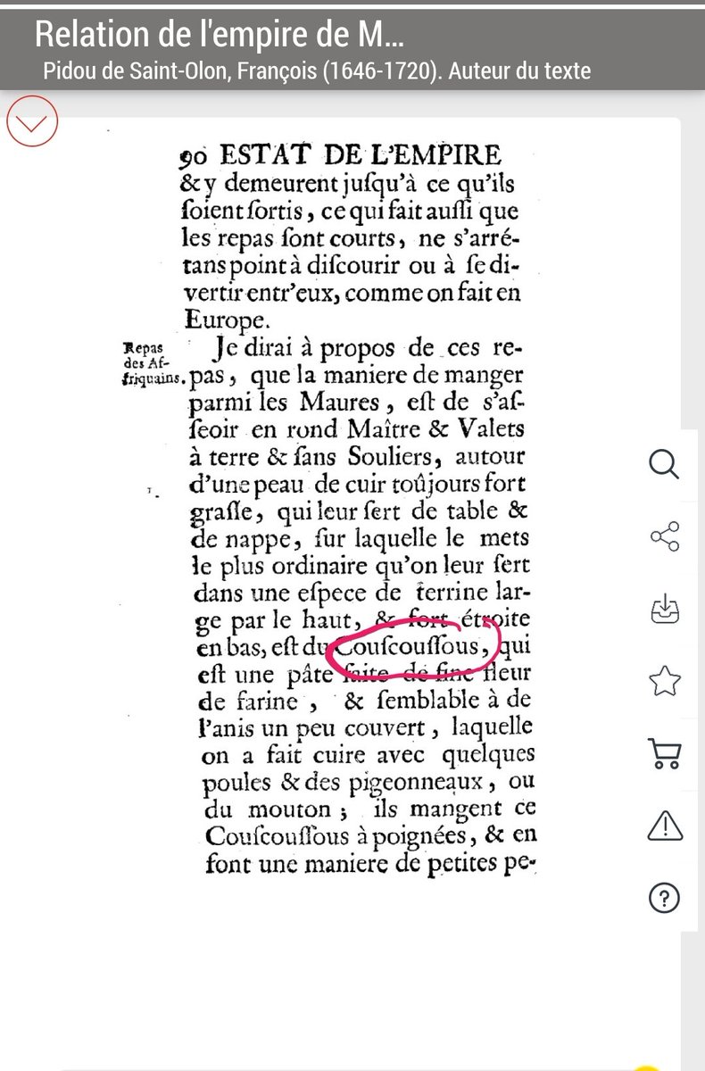 وانا ابحث عترت على كتاب هو اشبه بكنز كتبه سنة 1695 سفير اكبر ملوك فرنسا لويس14 مبعوتا عند اشهر ملوك #المغرب مولاي اسماعيل.. وفيه وصف المغرب وعاداته واهله.. وتوتيق لاصل الكسكس والقفطان واقتصاده وجيشه واشياء اخرى سنحاول دكر بعضها وسأضع رابط الكتاب آخر التريد