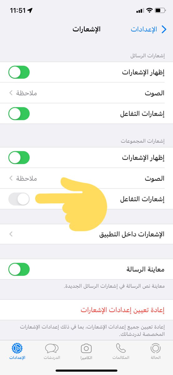 اللي يتضايق من إشعارات ردود الأفعال يستطيع ايقافها من خلال اعدادت الإشعارات في الواتساب 👇🏼