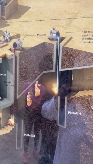 4. من الكمائن العجيبة في القلعة فتحات صبّ الدبس أو الزيت المغلي على رؤوس المهاجمين عند الأبواب كما في الصورة..