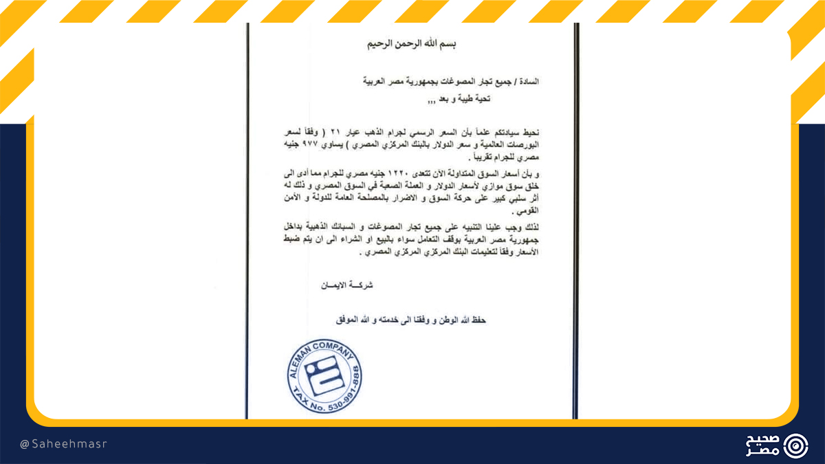 🔴 بالتزامن مع وصول سعر جرام #الذهب عيار 21 إلى 1249 جنيه، انتشر بيان على فيسبوك وتويتر بشكل واسع، الجمعة، لشركة تدعى "الإيمان" تدعو فيه تجار المصوغات وقف التعامل بالبيع والشراء لحين ضبط الأسعار.