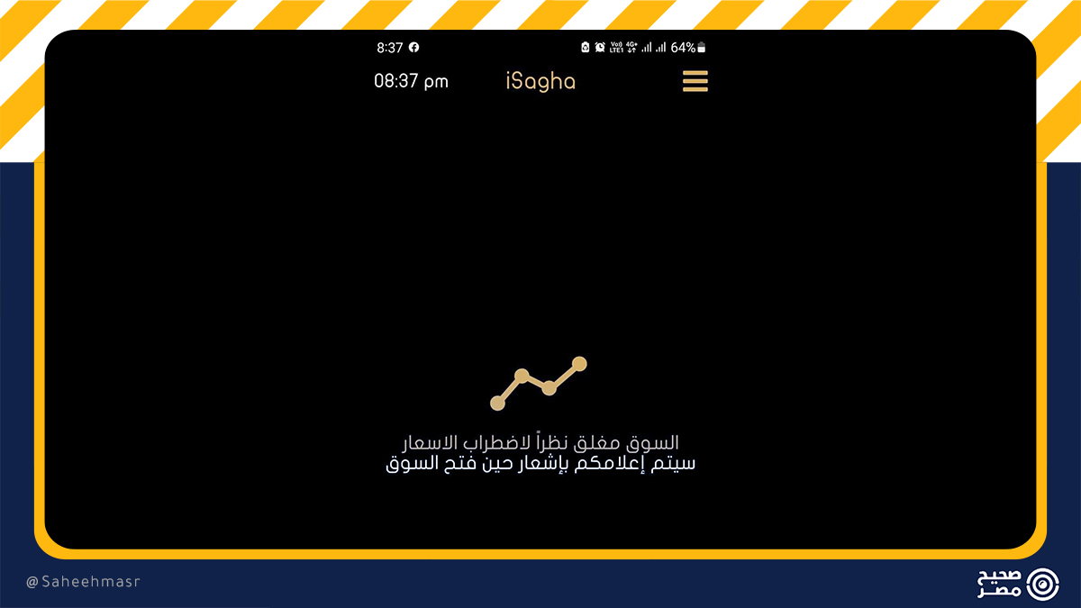 🔴 بعدها أوقف تطبيق آي صاغة @iSaghah عرض #أسعار_الذهب نظرا لما وصفه بـ "اضطراب الأسعار"، ونشر موقع القاهرة 24 تصريح لأمير رزق عضو شعبة الذهب، يقول فيه: "مفيش بيع وشراء في سوق الذهب بسبب ارتفاع الأسعار".