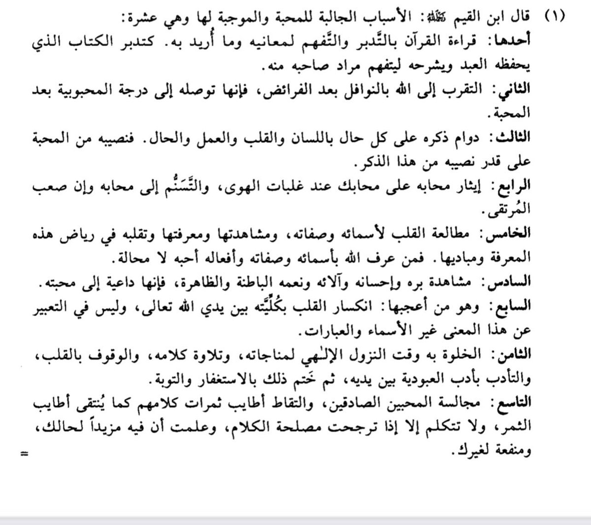 قال ابن القيم -رحمه الله-: الأسباب الجالبة للمحبة والموجبة لها وهي عشرة:
