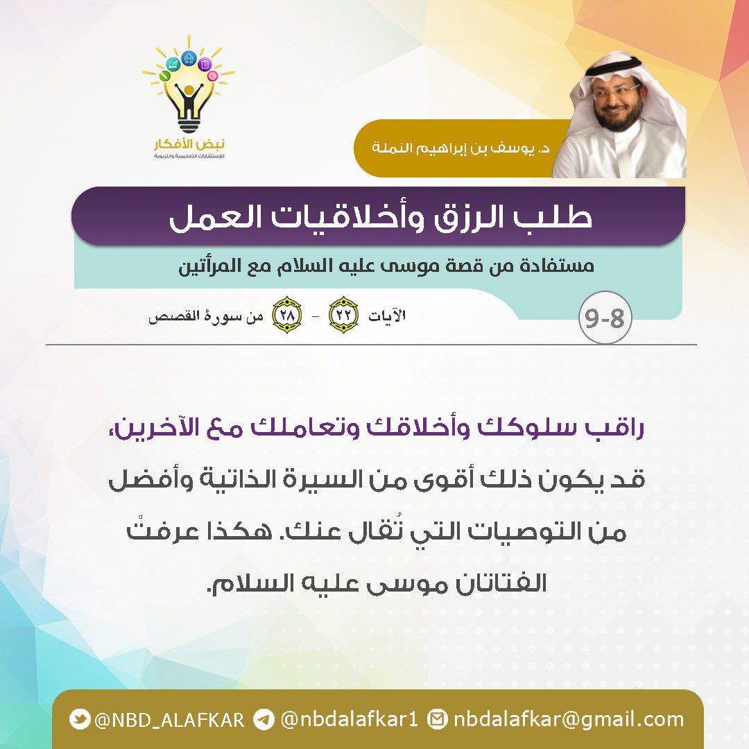9️⃣ فوائد حول طلب الرزق وأخلاقيات العمل مستفادة من قصة موسى عليه السلام مع المرأتين المذكورة في الآيات ( ٢٢-٢٨ ) من سورة القصص وهي من إعداد خبير الموارد البشرية د. يوسف بن إبراهيم النملة @YousefAlnamlah