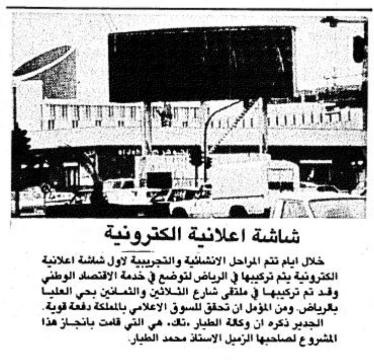 أما أول لوحة إعلانات إلكترونية في الرياض فكانت بتاريخ (١٤٠٣/٦/١٣) الموافق (١٩٨٣/٣/٢٧) تقاطع شارع الثمانين (طريق الملك فهد) مع شارع الثلاثين (الأمير سلطان) من قبل شركة "الطيار تاك".