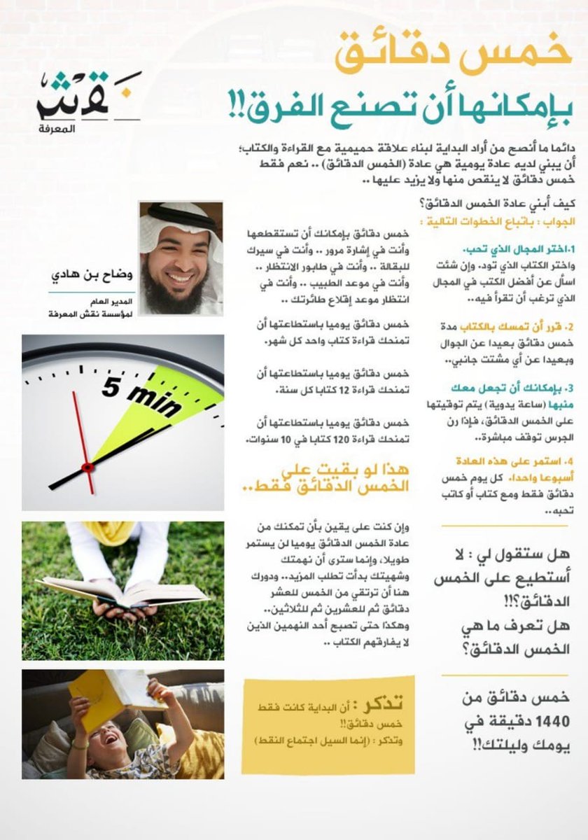 خمس دقائق يومية بإمكانها أن تمنحك قراءة كتابا واحدا كل شهر = 12 كتابا كل سنة. فكيف لو لازمت على 10 دقائق أو 20 دقيقة أو 30 دقيقة يوميا!