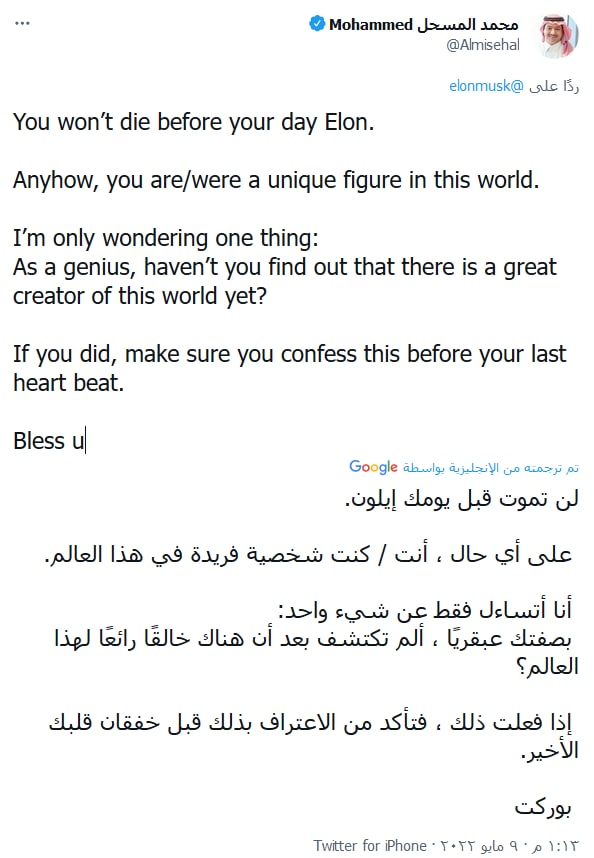 الأخ محمد المسحل يتساءل لماذا إيلون (الملحد) لم يجد بعدُ أن لهذا العالم خالقًا عظيمًا؟ ويأمل إن كان قد وجد ذلك أن يعترف به قبل آخر خفقةٍ لقلبه.