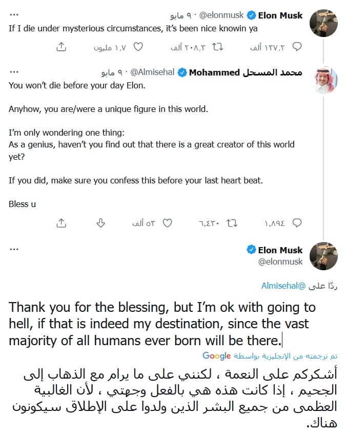 3. هل صدق إيلون في أنه مرتاح للمصير إلى جهنم أم أنه يستهزئ؟